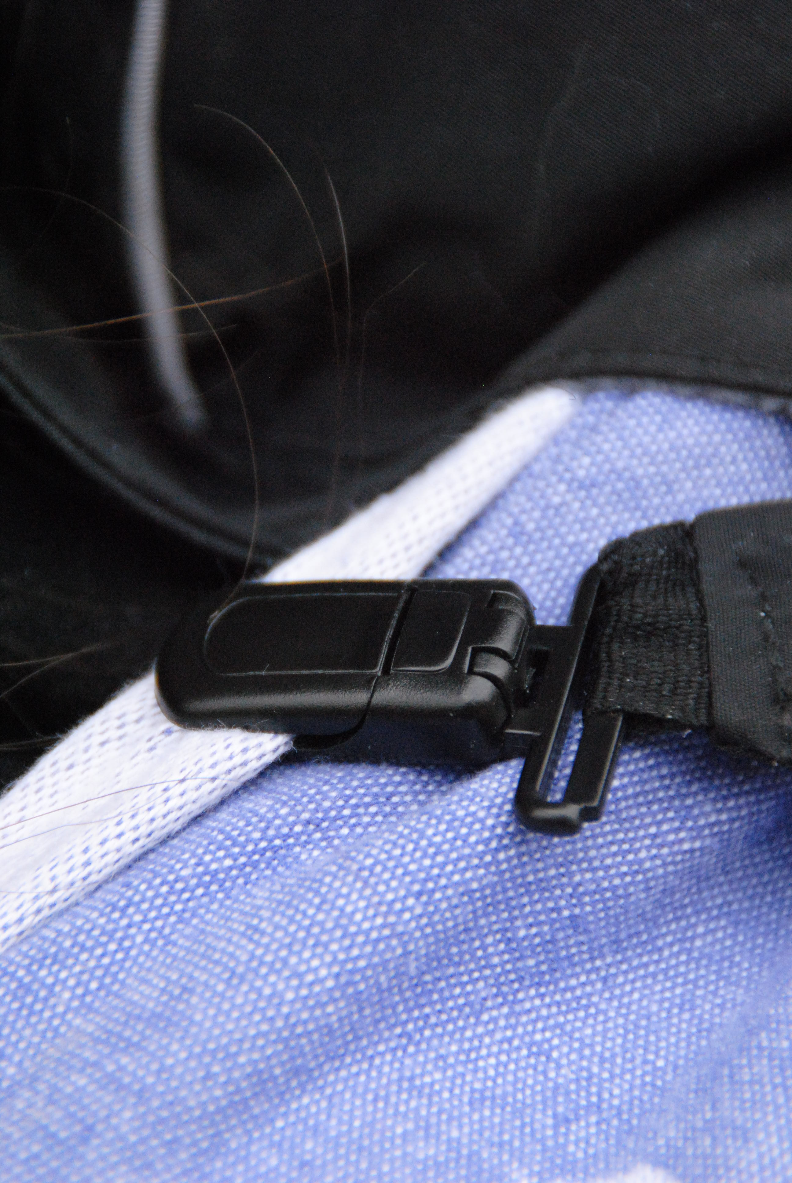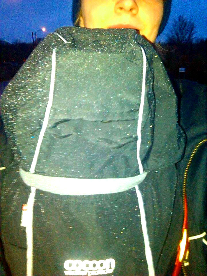 Mit Tragehilfe ist das Cover wesentlich schneller und stabiler anzubringen, jedoch lassen sich die Clips nur in einem kleinen Winkel öffnet und halten nicht an dick gepolsterten Trägern. Ich habe mit einer Trage getestet, die im oberen Schulterbereich gepolsterte Träger hat, deshalb musste ich das Cover recht tief anbringen, was dazu führte, dass die Kapuze nicht an der richtigen Stelle saß. Dem Zweck des Covers vor Regen zu schützen, wurde jedoch trotzdem entsprochen. Der Vorteil bei der Tragehilfe ist, dass das restliche Material vom Cover gut unter diese geschoben werden kann, wodurch das Tragen rein optisch kompakter wirkt.