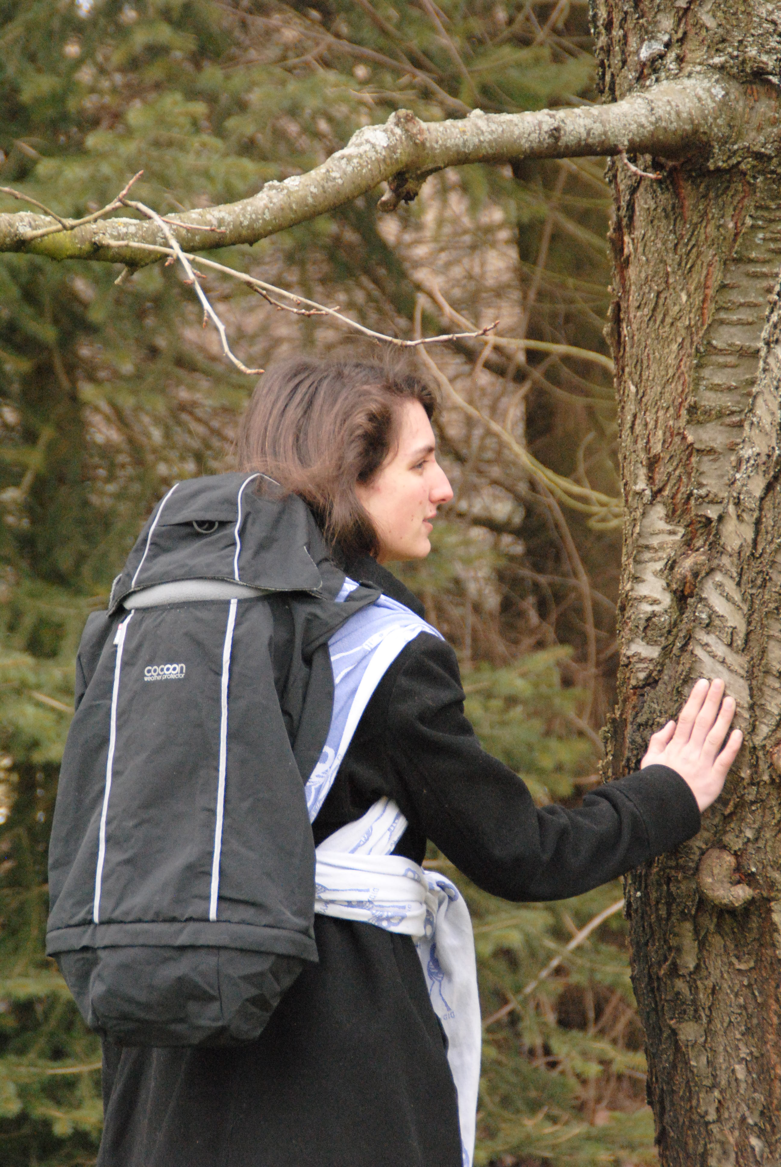 Beim Testen mit Tuch erweist sich als praktisch, dass man die Tuchenden, wenn man sie mit nach vorne bindet, im unteren Bereich des Covers verstauen kann und die Tuchenden somit auch trocken bleiben, man muss die Plastikhaken jedoch sehr hoch ansetzen, da das Cover sonst nicht hält. An den Seiten hat der Tragende eine Jacke, die über die Ränder des Tragecovers gehen sollte, so dass an den Seiten kein Wind hereinkommen kann. Dies ist beim Tuch wichtiger als bei der Tragehilfe, da das Tuch keine feste Begrenzung hat.