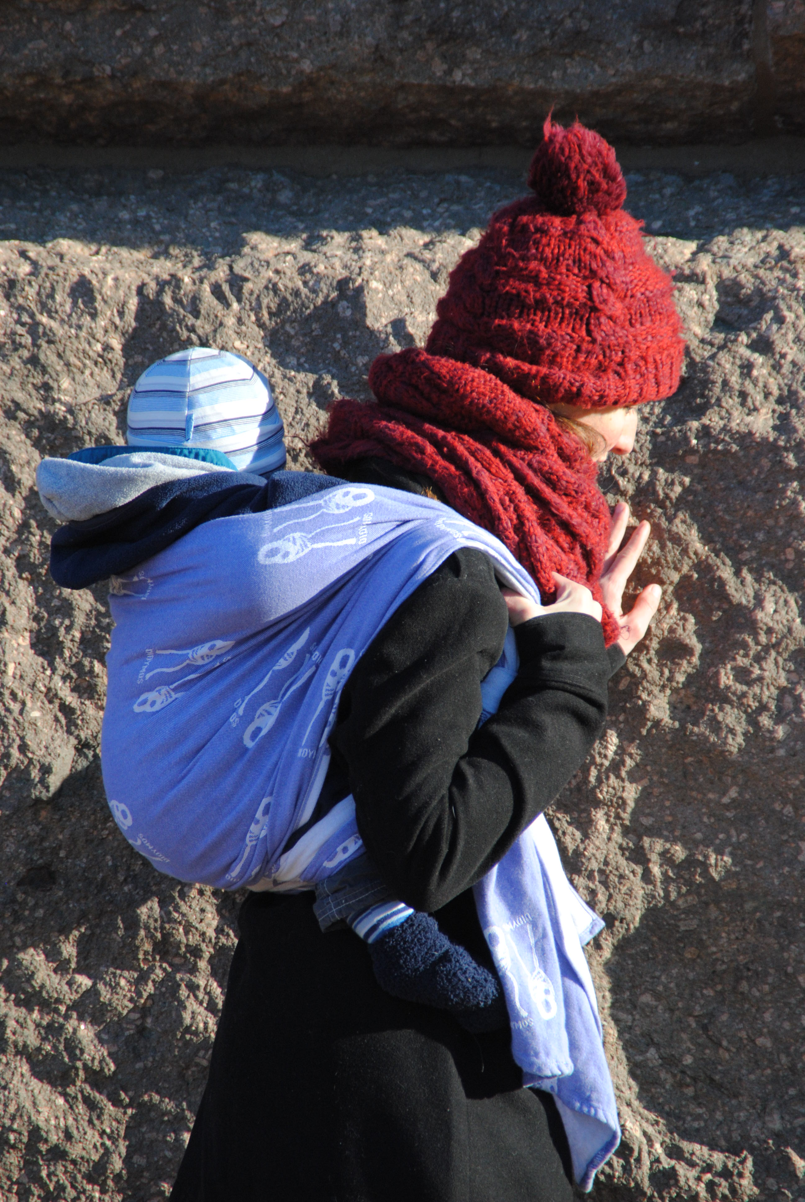Die Farbe (eine Seite blau mit weißen Symbolen; andere Seite weiß mit blauen Symbolen) konnte leider von uns nicht eindeutig identifiziert werden. Irgendwie stellt sich mir bei vielen Didymostüchern die Frage, warum es so viele verschiedene Farbvarianten gibt, wenn ich sie sowieso nur unterscheiden kann, wenn ich Tücher verschiedener Färbungen nebeneinanderlege. Vielleicht wären kleine Hinweisschilder in den Tüchern mit Tuchname und Herstellungsdatum nicht schlecht.