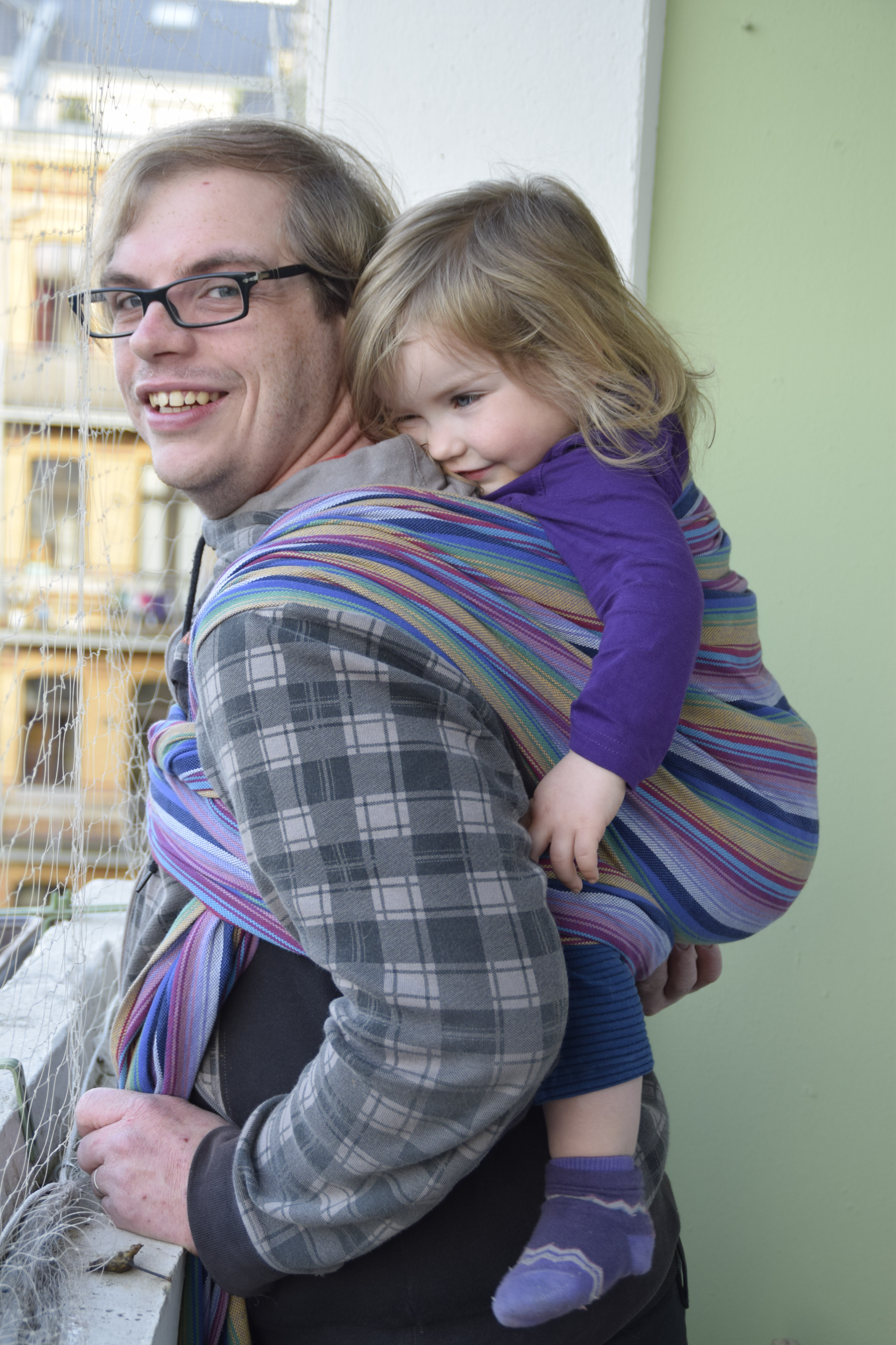 Sebastian: Meine Frau hat mich dazu bewogen. Sie hat von meiner Schwester ihr erstes Tragetuch geschenkt bekommen – ein Amazonas. Das Tragen hat dann bei unserem ersten Kind angefangen. Meine Frau hat unsere Tochter aus praktischen Beweggründen ein bisschen getragen. Es war einfacher für sie, wenn sie mit ihr in die Uni gegangen ist. Dann wurde es immer mehr bis unsere Tochter dem Tragen ganz entwachsen war.