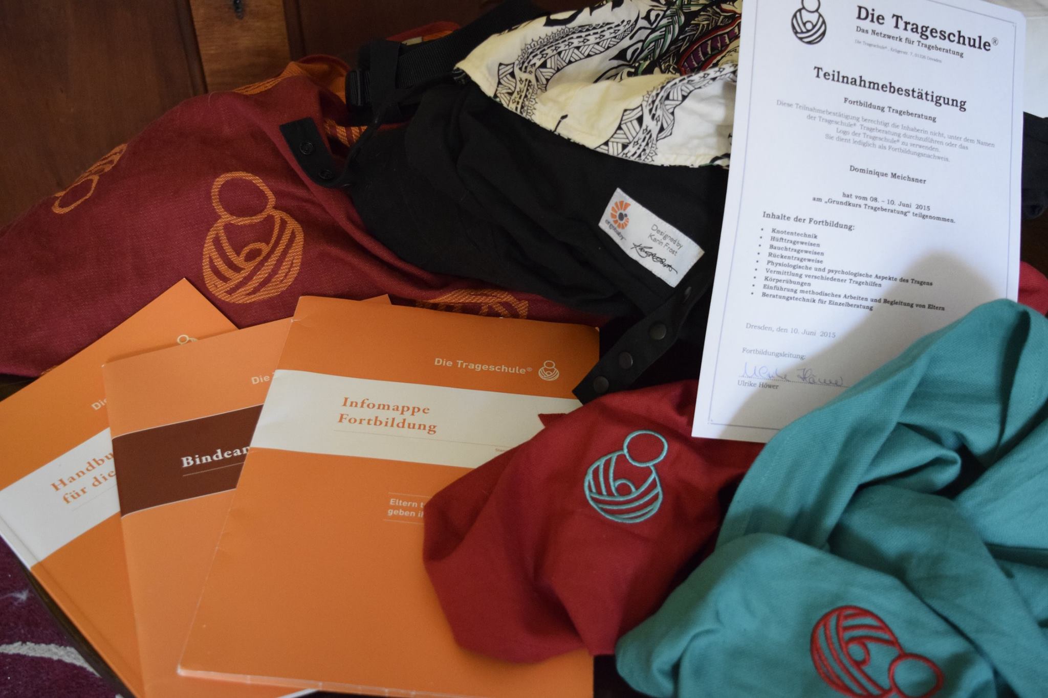 Domi ist glücklich, vom Grundkurs zur Trageberaterin aus Dresden zurück und hat viel Material für euch mitgebracht. Nächste Woche machen wir ein großes Planungstreffen und dann könnt ihr euch auch endlich von uns beraten lassen.
