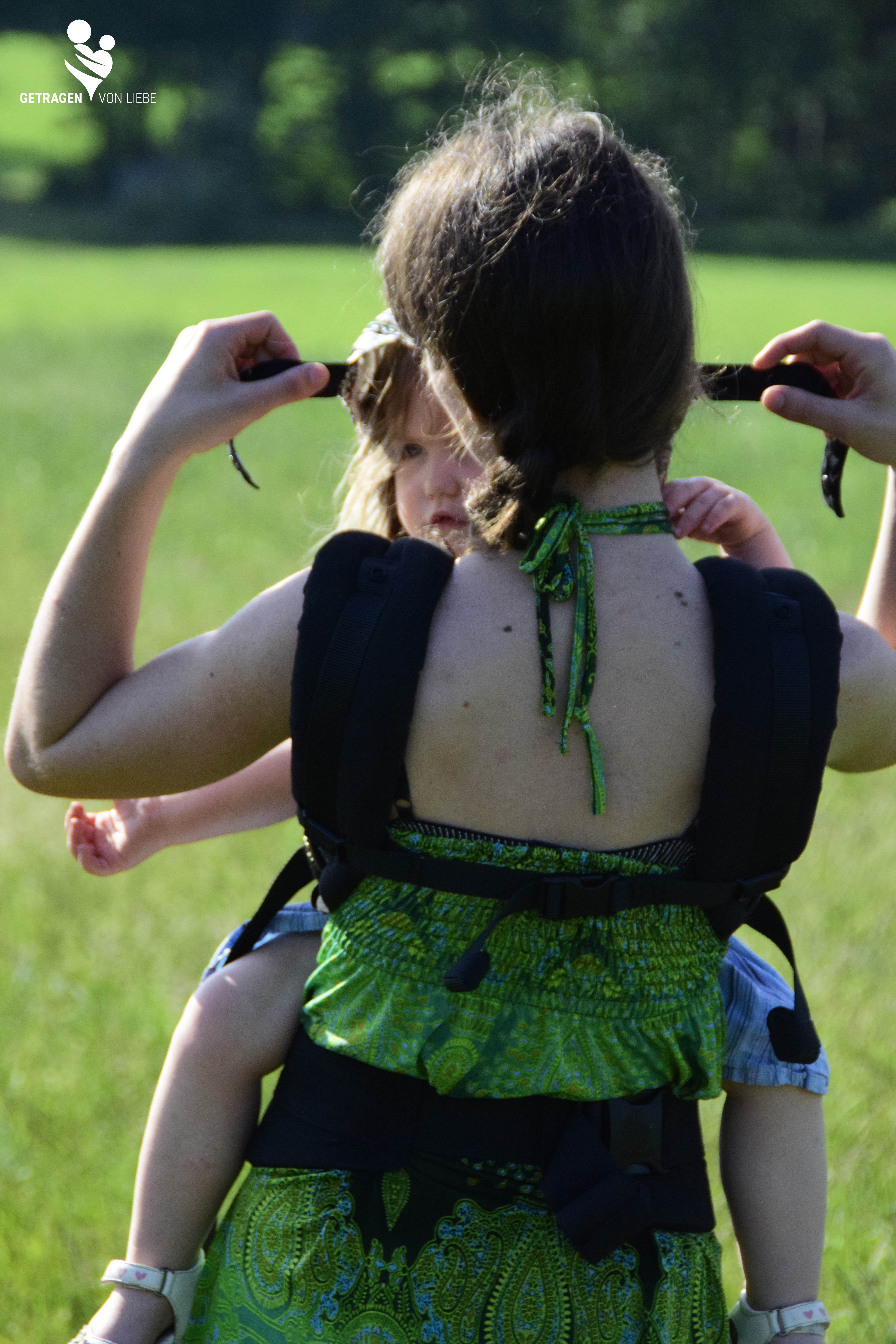 Die Schultergurte sind sehr schön gepolstert, aber auch recht breit, so dass sie bei meinem ersten Versuch über meine Schultern hinaus reichten. Mit verkürztem Rückengurt habe ich das Problem gelöst, allerdings nehmen die Träger dadurch eine leicht schiefe Position an mir ein, was aber nicht weiter störte. Man muss zum Schluss eine Schnalle schließen die auf dem Rücken liegt, diese ist in der Höhe verstellbar, so dass man seinen persönlichen Punkt suchen muss, an den man am besten kommt. Trotzdem kann das zu Schwierigkeiten führen. Ein Tipp, den ich bekommen habe, um das zu umgehen ist: die Schnalle einfach schon vorher ganz runter fahren und dann mit dem Kopf hindurchzuschlüpfen. Leider geht das nicht mehr besonders gut, wenn man selbst eher klein und das Kind eher groß ist^^.