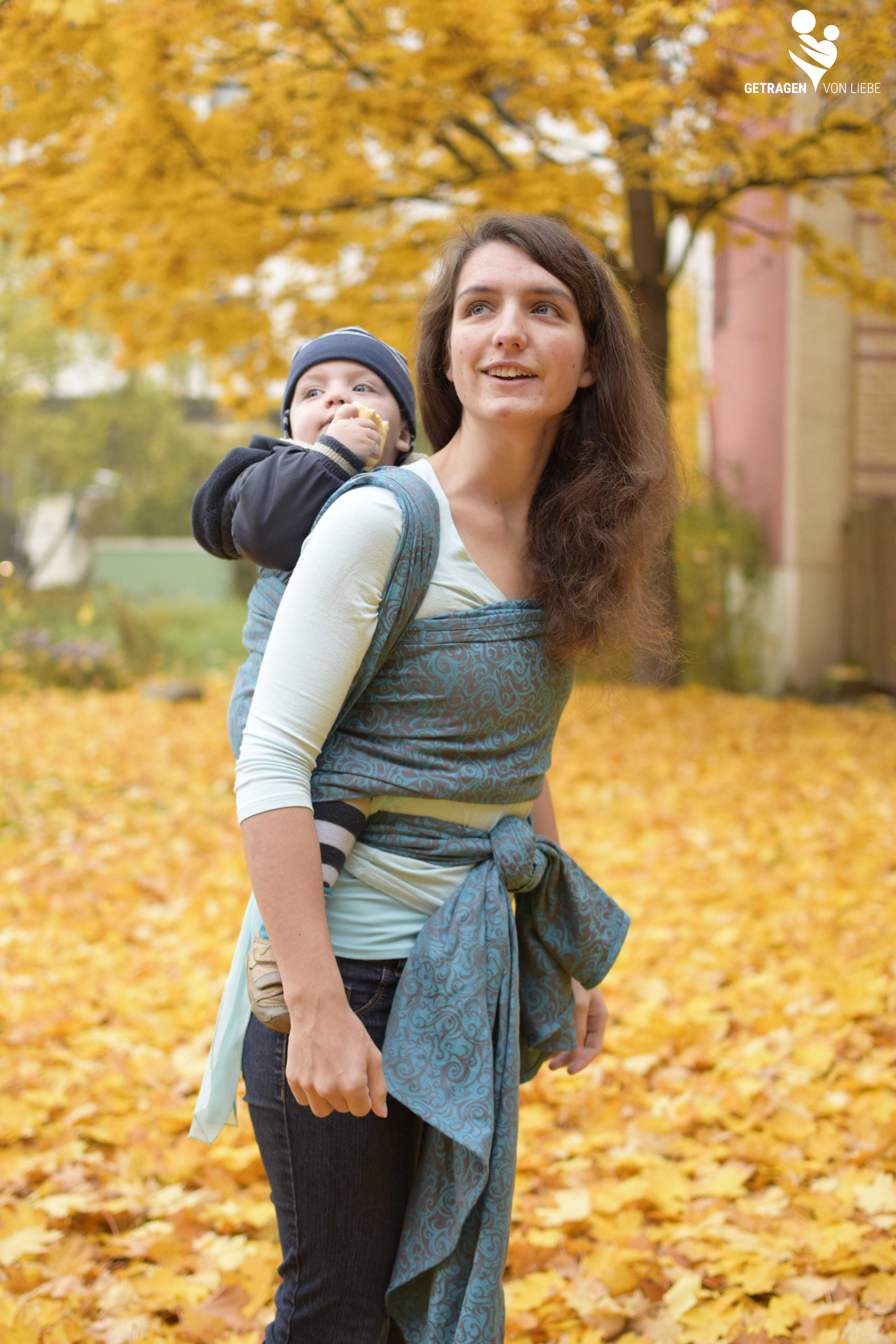 Was außerdem besonders auffällt ist, dass das Tuch sehr, sehr dünn ist. Dennoch liegt das Flächengewicht bei 220g/m². Dass man es bis zum Ende der Tragzeit nutzen kann, wie der Hersteller sagt, würde ich einklammern. Bei meinem elf-Kilo-Kind macht Tragen damit schon keinen Spaß mehr. Und selbst mit 3,5Kilo fand ich das Tragegefühl nicht herausragend. „Wer schön sein, will muss leiden“ trifft es wohl ganz gut. Allerdings hat man dafür auch nur einen Miniknoten, was gerade mit Neugeborenem kurz nach der Geburt sehr angenehm sein kann.