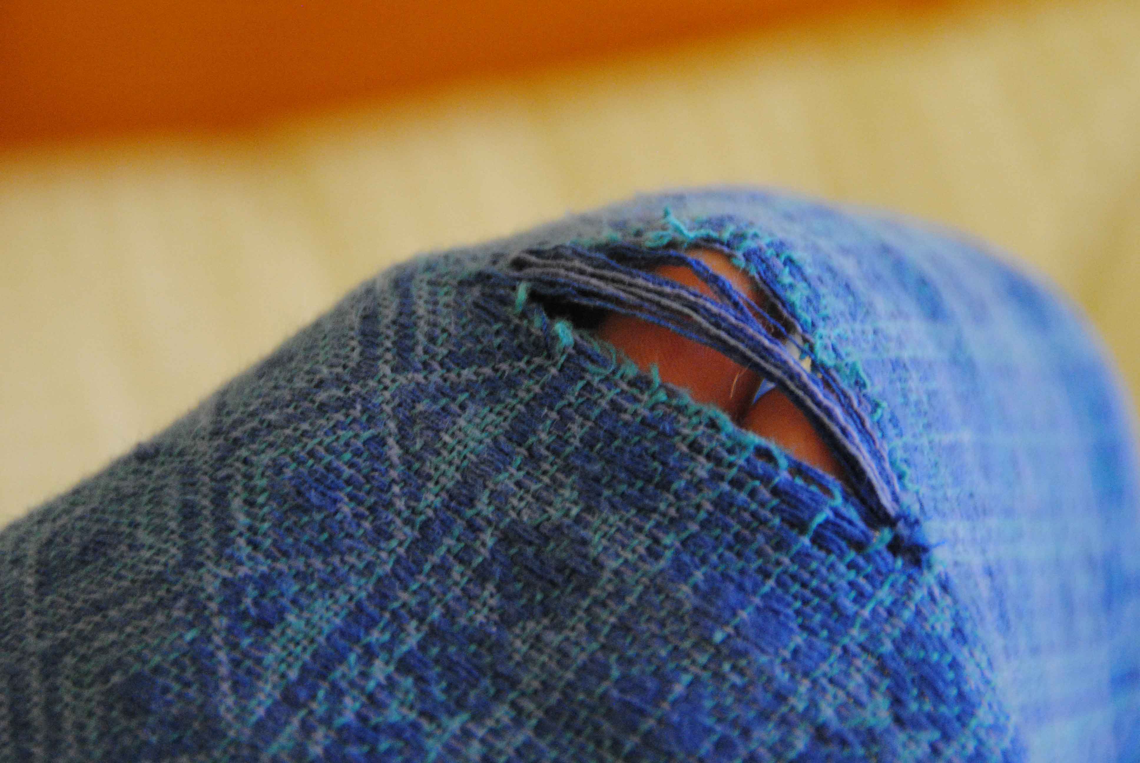 Mein erstes gebrauchtes Tuch, das ich ergattern konnte, hielt genau zweimal Tragen. Dann machte es laut Ratsch und ein daumendicker Riss zog sich mittig durch das Tuch. Du kannst ihn oben sehen. Ich war ziemlich verzweifelt, wollte aber nicht so schnell aufgeben.