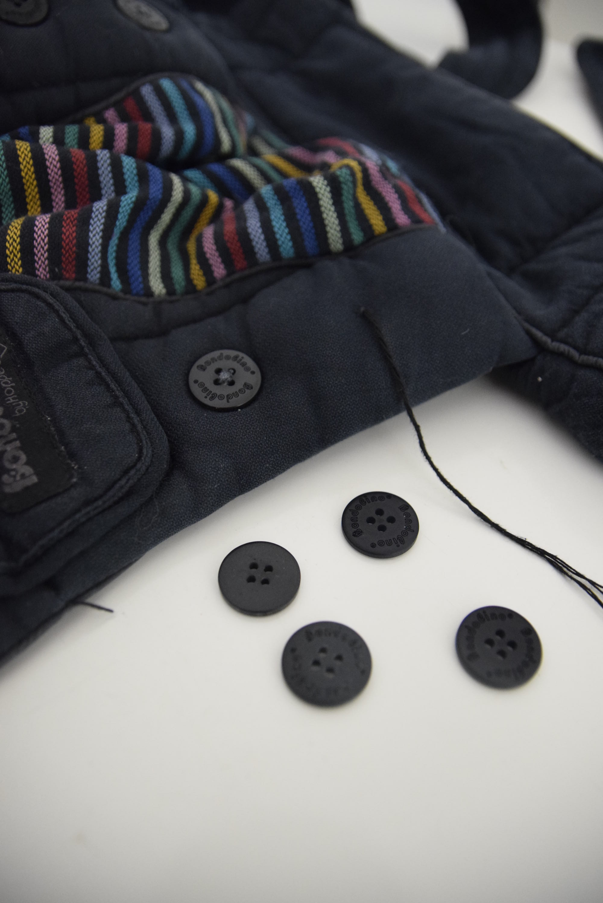 Das Gleiche trifft auf abgefallene Knöpfe zu. Immer zuerst den Hersteller anfragen. Auch hier werden Ersatzknöpfe zum Annähen gern kostenfrei oder gegen eine kleine Gebühr ausgehändigt. Im Bild sieht man eine Trage von Hoppediz, die ich schon mit fehlendem Knopf geschenkt bekommen habe. Die Firma hat mir gleich einen ganzen Satz zum Reparieren geschickt.