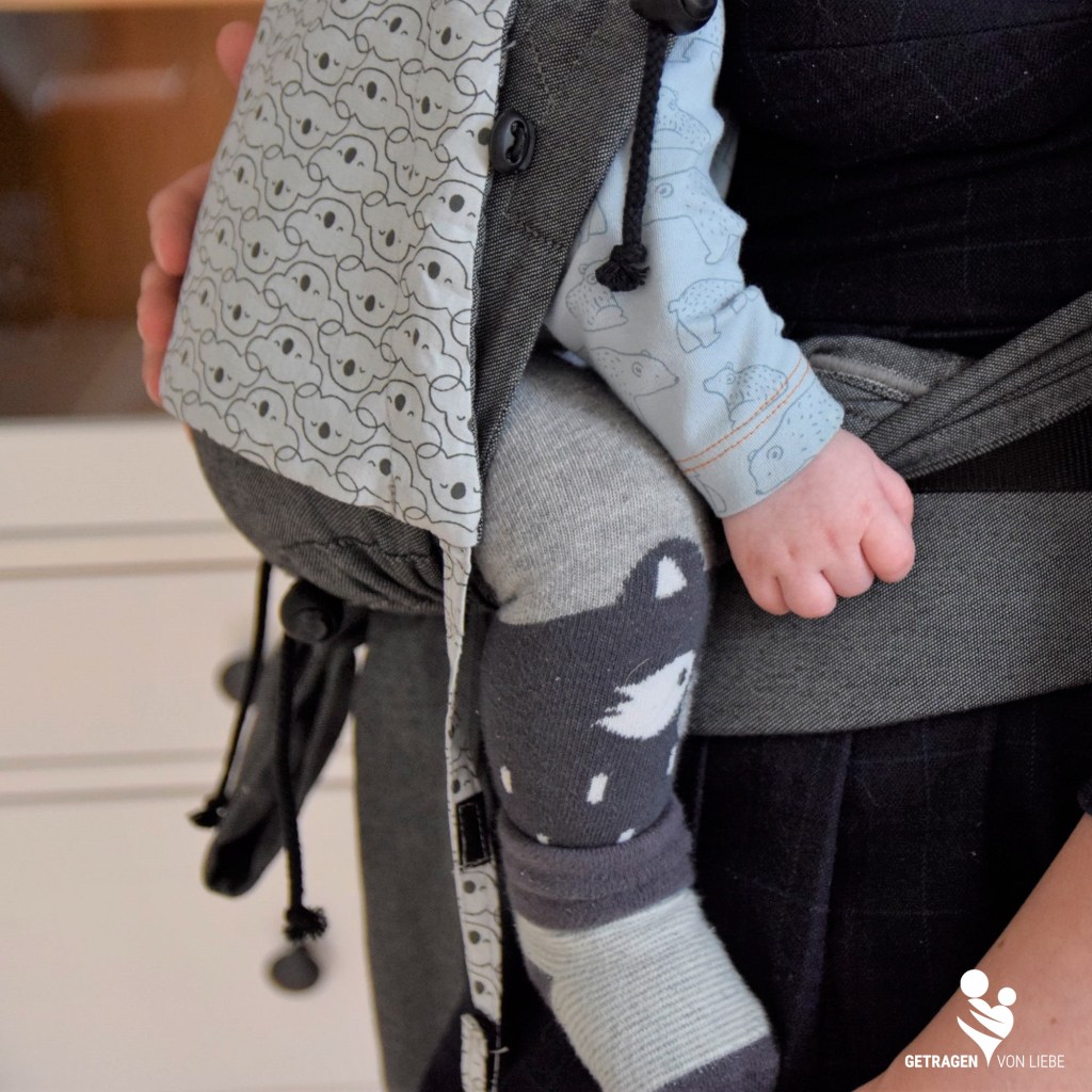 Das Rückenpanel ist 43cm lang. Eine Mama mit Minibaby in der Trageberatung war ganz erstaunt, wie lang die Trage im Vergleich zu anderen ist. Das Rückenpanel kann durch entsprechendes Tragen so verkürzt werden, dass es auch für kleine Babys reicht. Dieser Bereich besteht aus dünnem Tragetuchstoff, der sich dem Babyrücken perfekt anpassen kann. Im oberen Bereich des Rückenteils befindet sich noch jeweils ein Kordelzug an den Rändern um Feinanpassungen vorzunehmen.